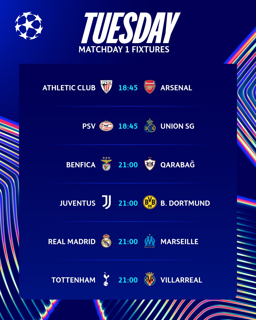បាល់ទាត់ UEFA Champions League ត្រលប់មកវិញនាថ្ងៃនេះហើយ ខណះ ៣ គូរស៊ុបដែលមិនគួរមើលរំលងសម្រាប់យប់នេះរួមមាន Arsenal, Marseille និង Juventus៕